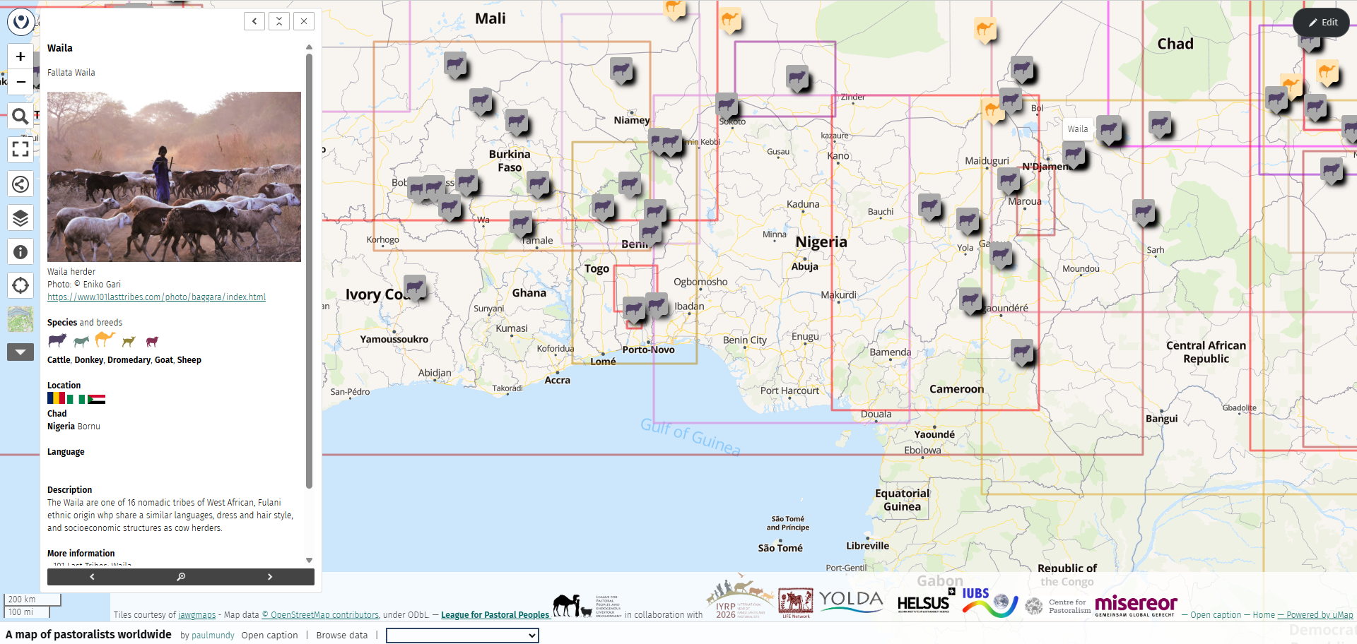 Click on any of the small icons to see details of that group in the sidebar. Click on the edges of the red or brown rectangles to show maps of pastoralists’ migration routes.